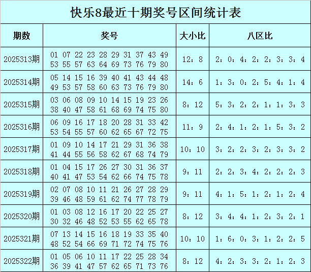 福彩快乐8第2025322期奖号为:01 05 06 10 11 17 22 25 28 34 36 39 41 47 57 62 65 71 73 76,其中奖号大小比为8:12,八区比为4:2:3:3:2:1:2:3。