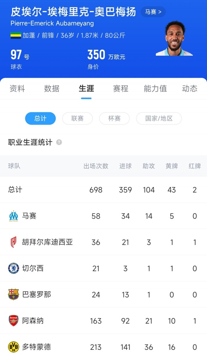 今年夏窗自由身回归马赛后,奥巴梅扬本赛季7场比赛已经贡献了4粒进球和2次助攻。目前36岁的奥巴梅扬德转身价为350万欧元,而在2018年巅峰时期,效力于阿森纳的奥巴梅扬身价最高曾达到7500万欧元。