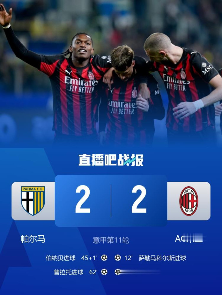 直播吧11月9日讯北京时间11月9日凌晨3:45,2025-26赛季意甲联赛第11轮,帕尔马坐镇恩尼奥塔迪尼球场迎战AC米兰。上半场恩昆库助攻萨勒马科尔斯贴地斩破门,随后萨勒马科尔斯造点,莱奥点射命中,布里奇吉助攻伯纳贝轰出世界波,米兰暂2-1帕尔马;下半场布里奇吉再送助攻,普拉托头球破门,迈尼昂献神扑,萨勒马科尔斯失单刀,最终米兰2-2帕尔马,10轮不败,先赛一场积分追平榜首。