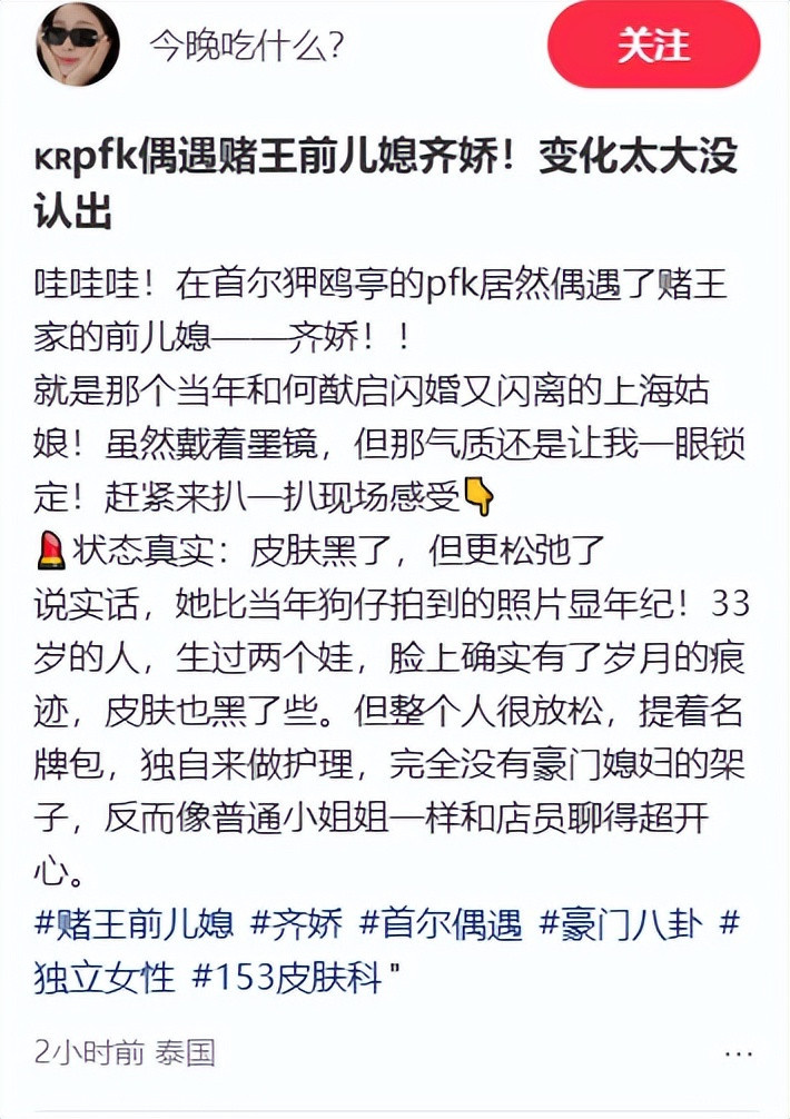 这不,近日就有网友在韩国首尔某皮肤科诊所偶遇齐娇。