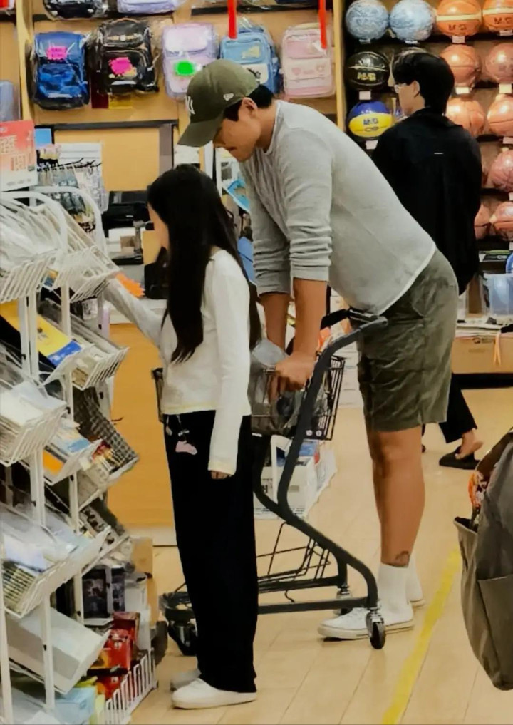 照片中的老高带着个遮阳帽,宠溺的跟小酒窝一起买文具、吃饭。