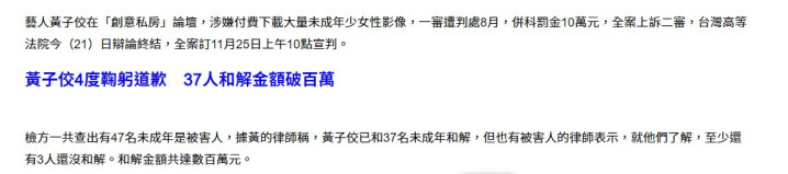 检方一共查出有47名未成年是被害人,据黄的律师称,黄子佼已和37名未成年和解,但也有被害人的律师表示,就他们了解,至少还有3人还没和解,和解金额共达数百万元。