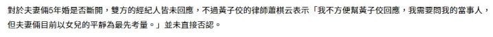 对于夫妻俩5年婚是否断开,双方的经纪人均未回应,不过黄子佼的律师萧棋云表示“我不方便帮黄子佼回应,我需要问我的当事人,但夫妻俩目前以女儿的平静为最先考量。”并未直接否认。