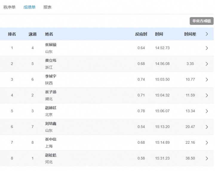 直播吧11月17日讯全运会男子1500米自由泳决赛,18岁山东选手张展硕以14分52秒73夺得金牌,浙江选手费立纬获得银牌。