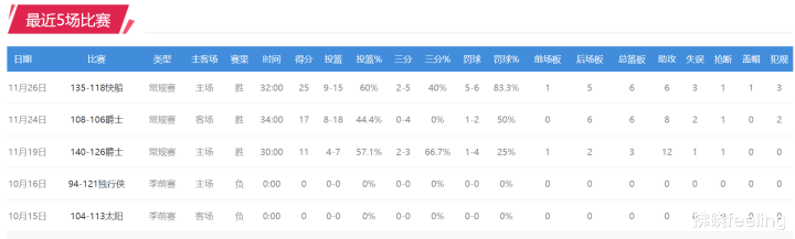 7、最高三分命中数:2(2025/11/19 爵士 126-140 湖人、2025/11/26快船118-135 湖人)