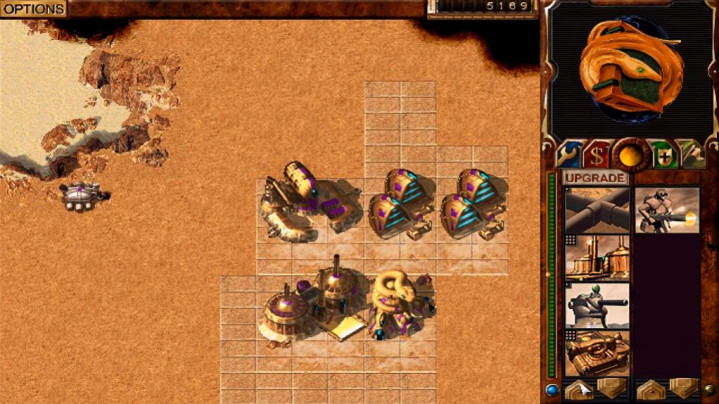 三大家族的差异化设计,让《沙丘2000》的策略深度远超同期许多作品。亚崔迪家族有弗瑞曼战士和声波武器加持,擅长阵地战和游击战;哈肯尼家族依赖萨督卡精锐部队和核弹攻击,走的是暴力碾压路线;奥多斯家族则以破坏者突击队和部队控制能力见长,玩法诡谲多变。玩家需要围绕香料采集制定战略,建造基地、研发科技、部署军队,每一步决策都影响着战局走向。这种“资源-科技-战斗”的闭环设计,后来成为许多RTS游戏的模板。